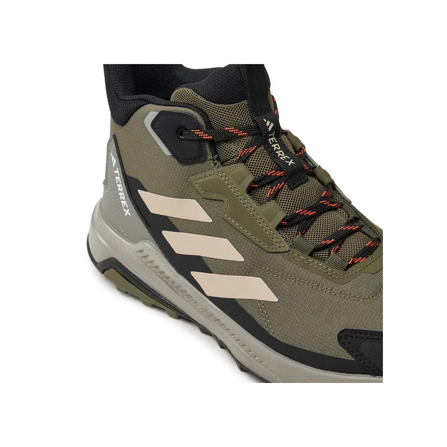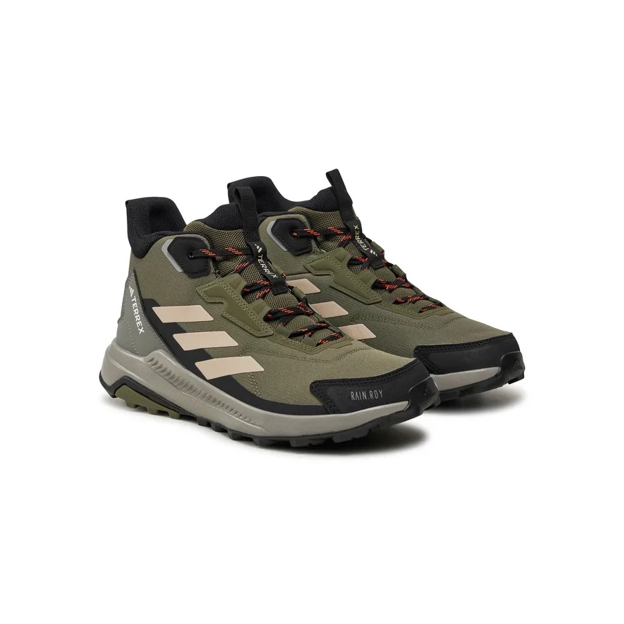 Adidas Terrex Anylander Mid Rain.RDY (ID0897) je pánska turistická obuv s stredne vysokým strihom, dostupná v rôznych farebných kombináciách, napríklad Olive Strata / Wonder Beige / Core Black. Zvršok tvorí kombinácia textilných a syntetických materiálov, ktorá je ľahká a priedušná, a obuv je vybavená technológiou RAIN.RDY, ktorá odpudzuje vlhkosť. Klasické šnurovanie zabezpečuje dobré uchytenie, Traxion gumová podrážka skvelú priľnavosť a EVA medzipodrážka pohodlné odpruženie. Vhodná na každodenné turistické a outdoor aktivity.